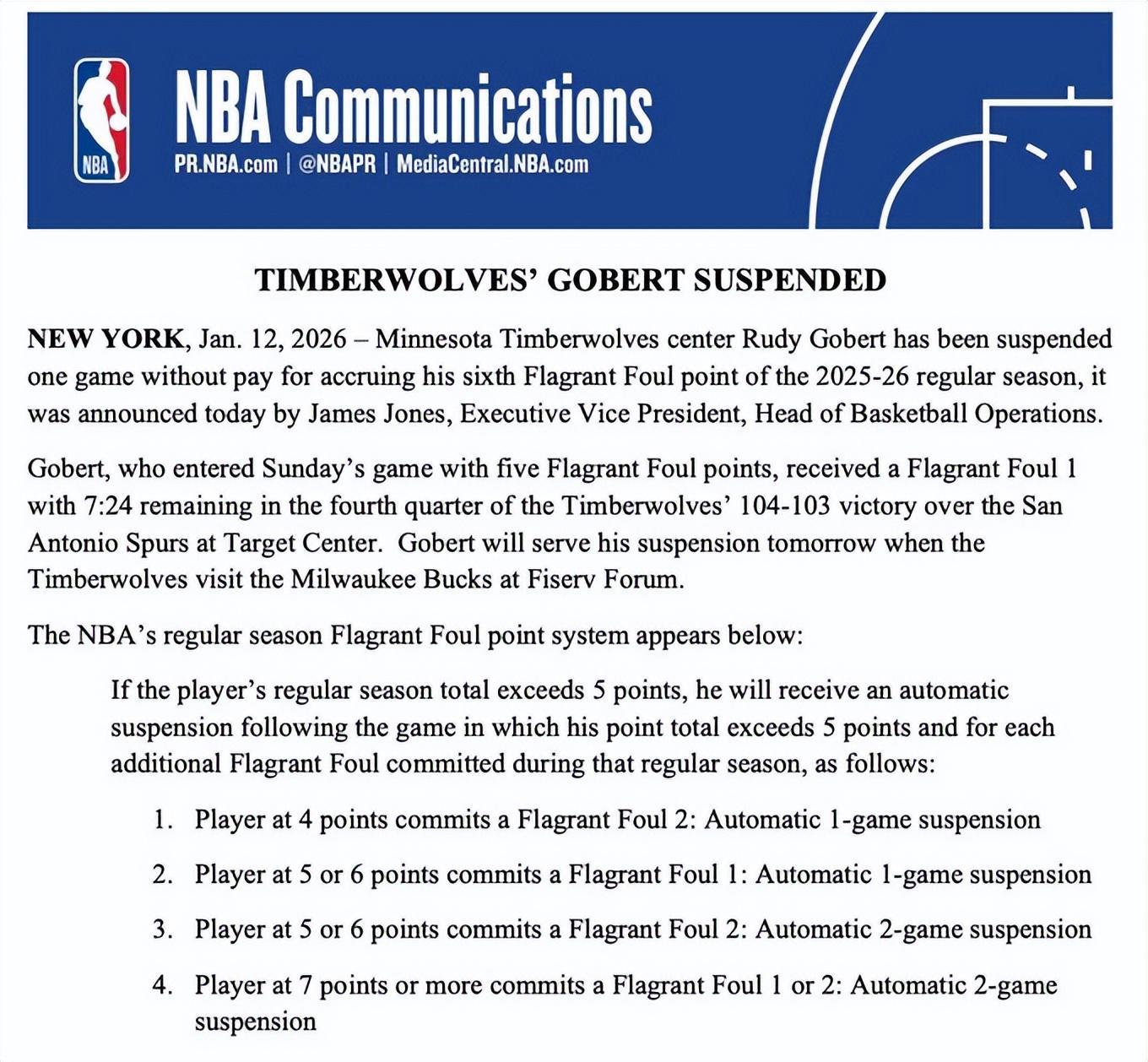 北京时间1月13日,NBA官方宣布,明尼苏达森林狼队中锋戈贝尔因在2025-26赛季常规赛中恶意犯规积分累计达到6分,将被无薪禁赛一场。此次禁赛将让戈贝尔损失201149美元的薪水。森林狼队也将因此获得100575美元的奢侈税差额抵免。在昨日森林狼以104-103战胜马刺的比赛中,第四节还剩7分24秒时,戈贝尔在文班亚马三分出手时,做出了一次危险的扑防动作。...